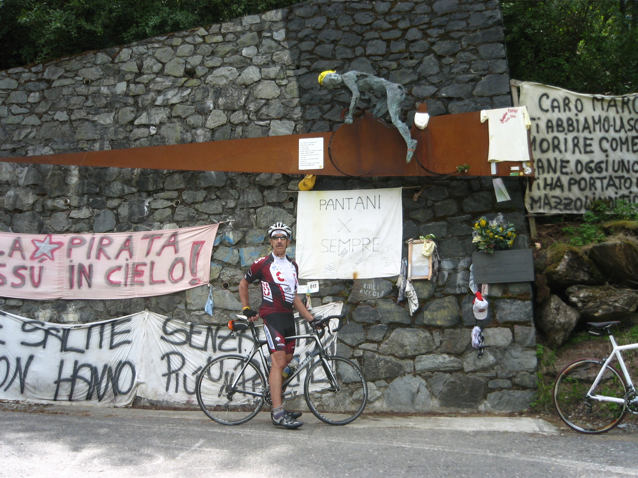 Memorial to the great Italian bike racer, Marco Pantani. Half way up the climb of the Moitirollo